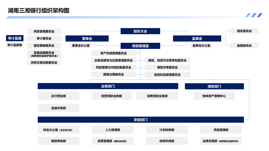三湘银行根据《公司法》《商业银行法》《银行保险机构公司治理准则》等相关法律法规与监管要求,按照上市银行规范,初步构建了“决策科学、执行有力、监督有效、运转规范”的法人治理结构,充分发挥董事会在公司治理体系中的核心作用,“三会一层”职责清晰、协同运作、相互制衡。