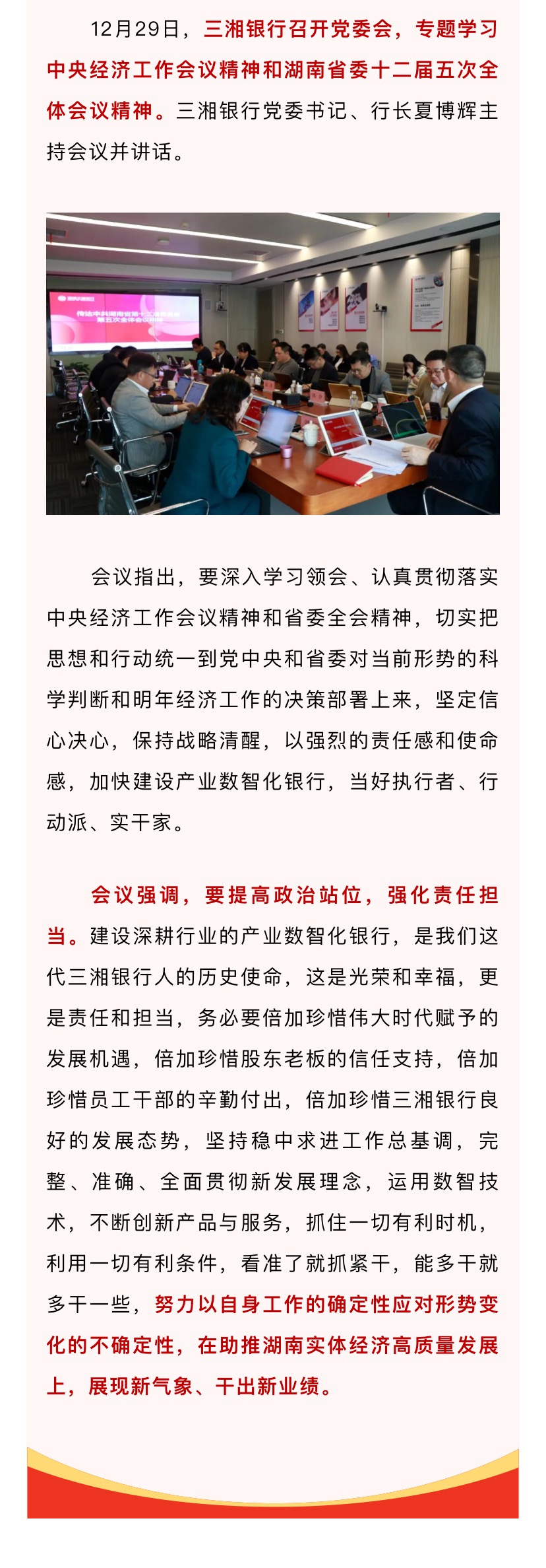 三湘银行传达学习中央经济工作会议和湖南省委十二届五次全体会议精神