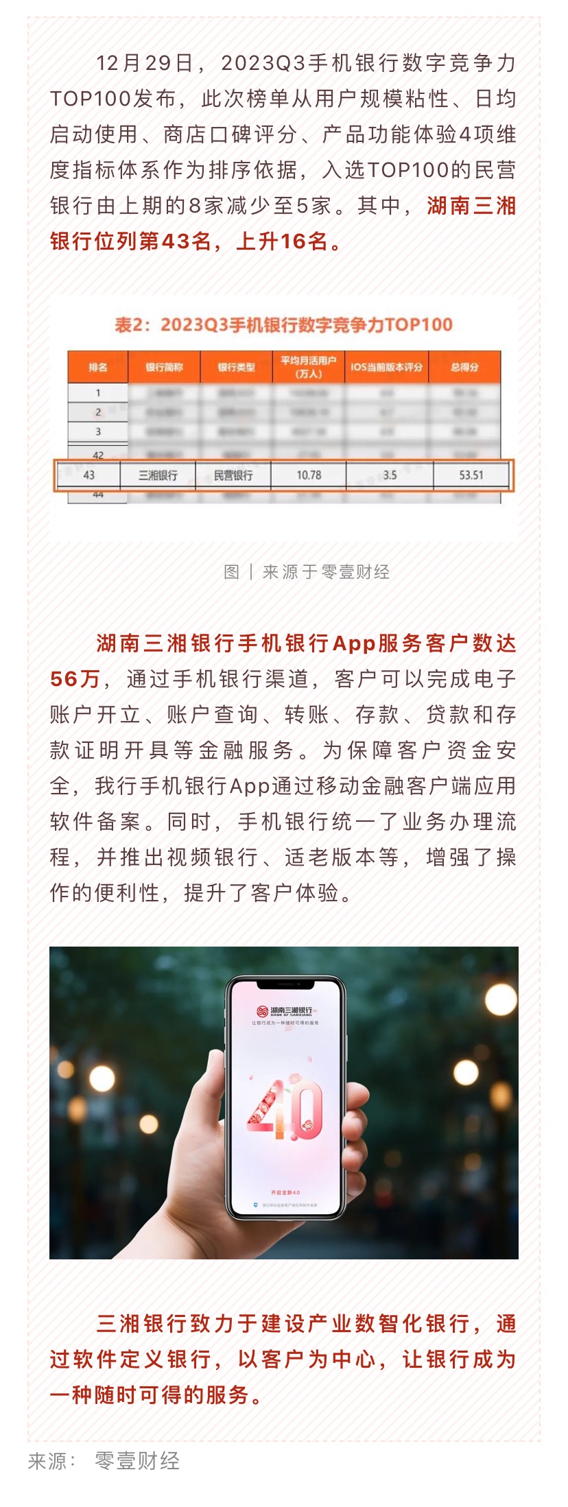 43名!湖南三湘银行上榜手机银行数字竞争力百强榜