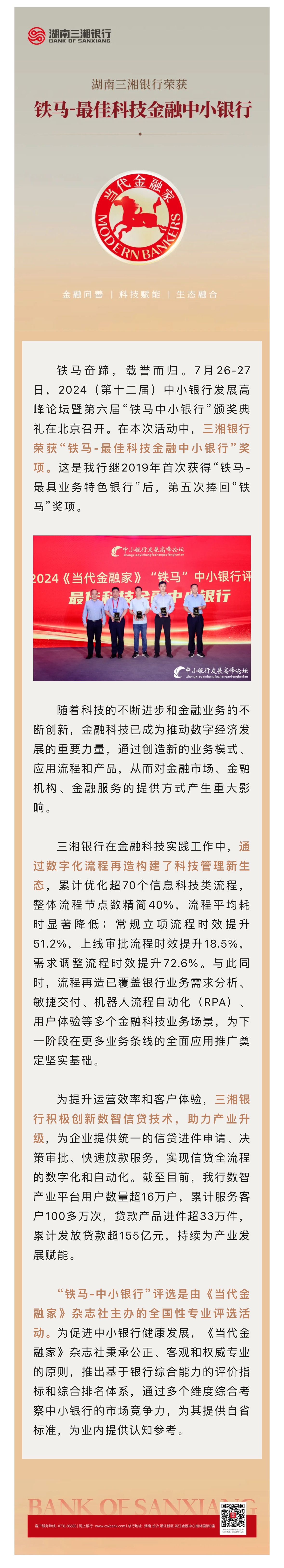 蝉联五届!三湘银行荣获“铁马-最佳科技金融中小银行”奖项