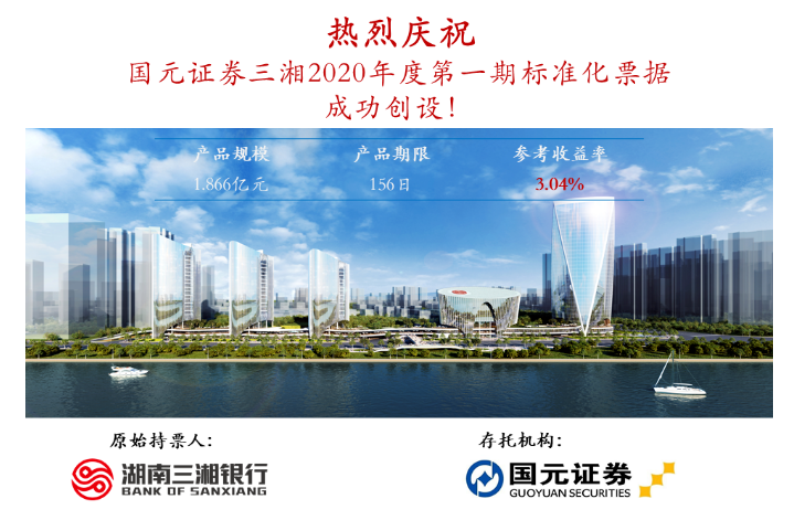 2020年9月30日,三湘银行作为原始持票人创设的“国元证券三湘2020年度第一期标准化票据”成功发行,产品规模1.86亿元,期限155天,参考收益率3.04%,本项目核心信用为承兑行兴业银行股份有限公司,资质优良,发行成本低于同期票据贴现利率约31BP,为湖南省首单标准化票据。