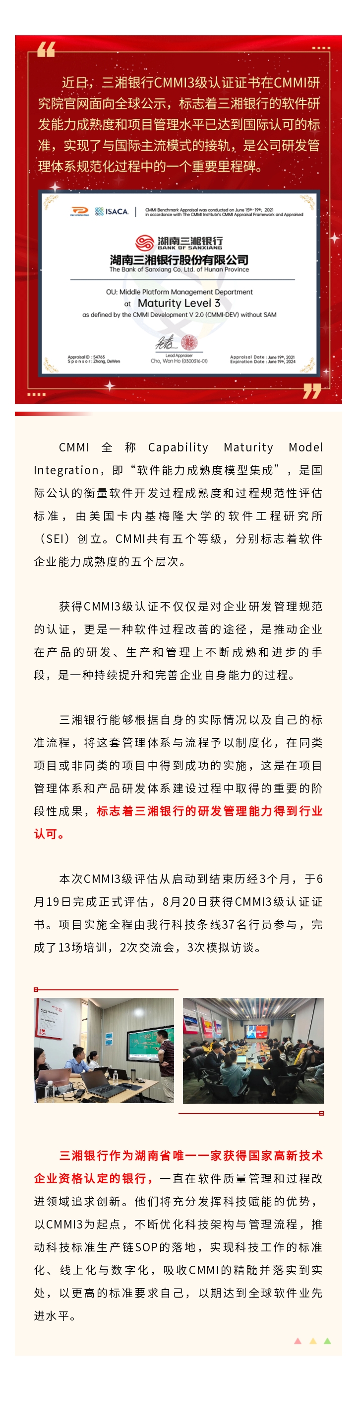 标题:喜讯丨三湘银行通过CMMI3级认证,软件能力成熟度获国际认可