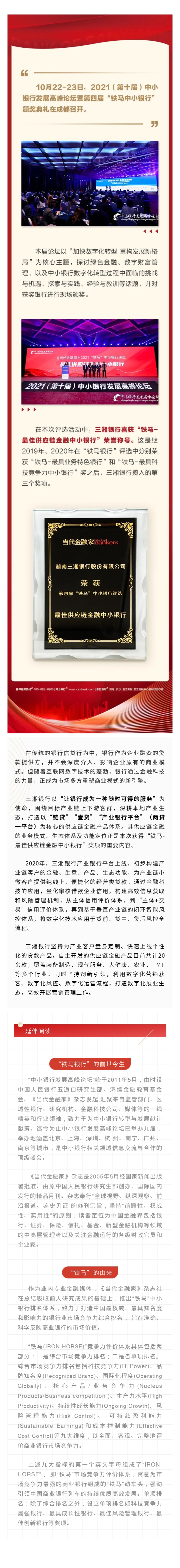 蝉联三届!三湘银行喜获“铁马-最佳供应链金融中小银行”荣誉称号