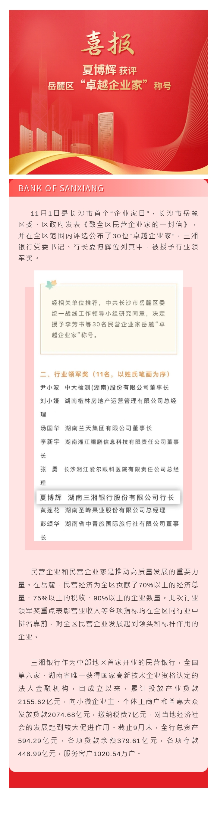 三湘银行行长夏博辉获评岳麓区“卓越企业家”称号
