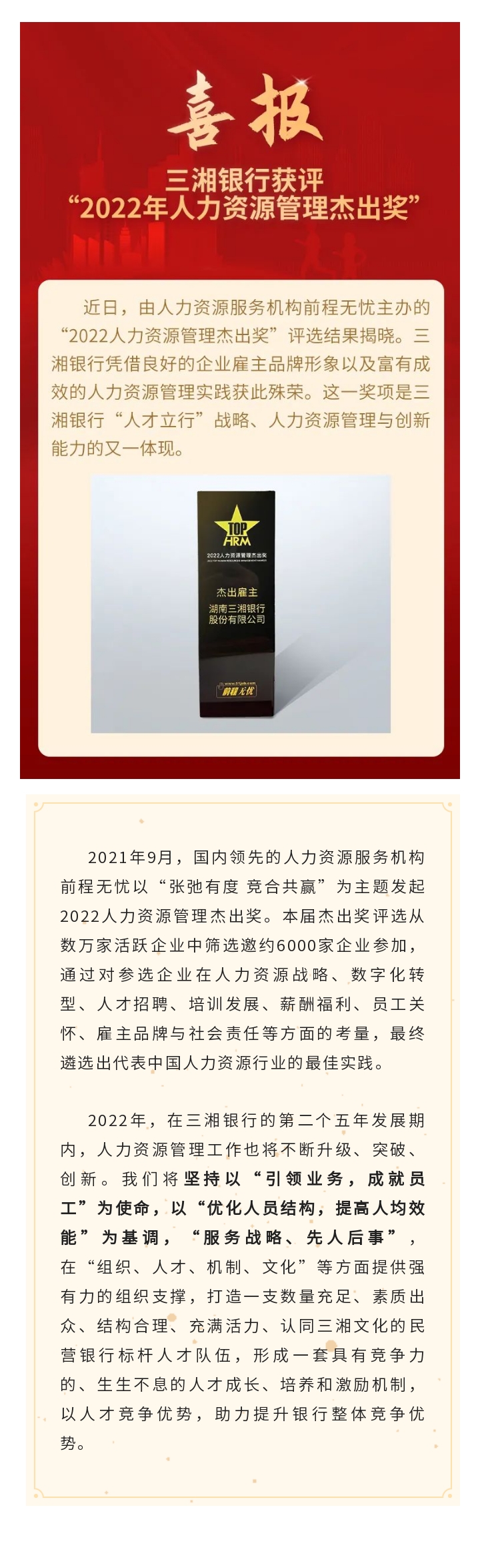 喜报丨三湘银行获评“2022年人力资源管理杰出奖”