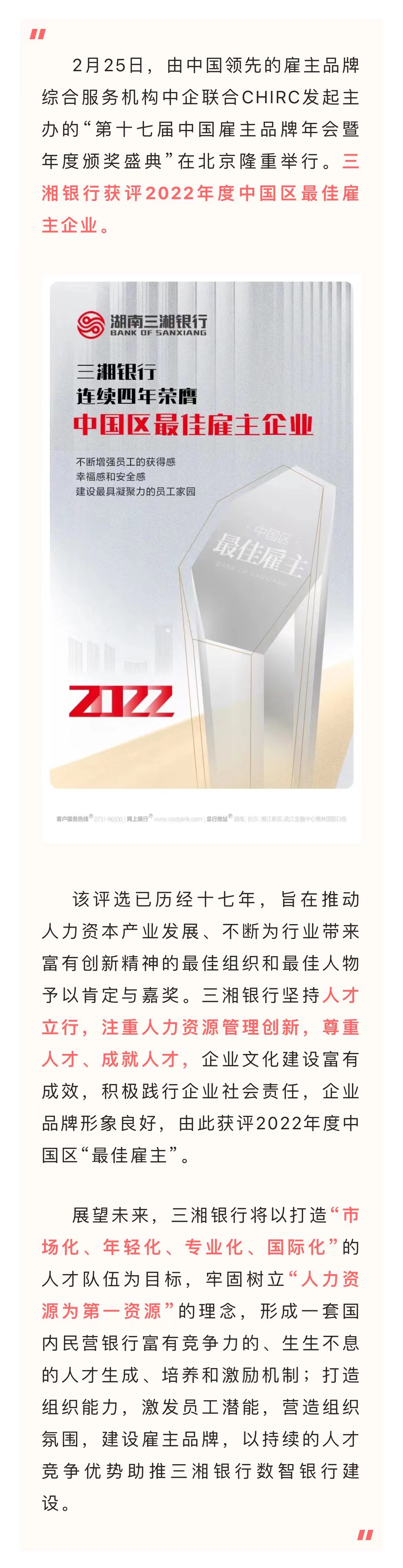 三湘银行四度蝉联中国区最佳雇主企业