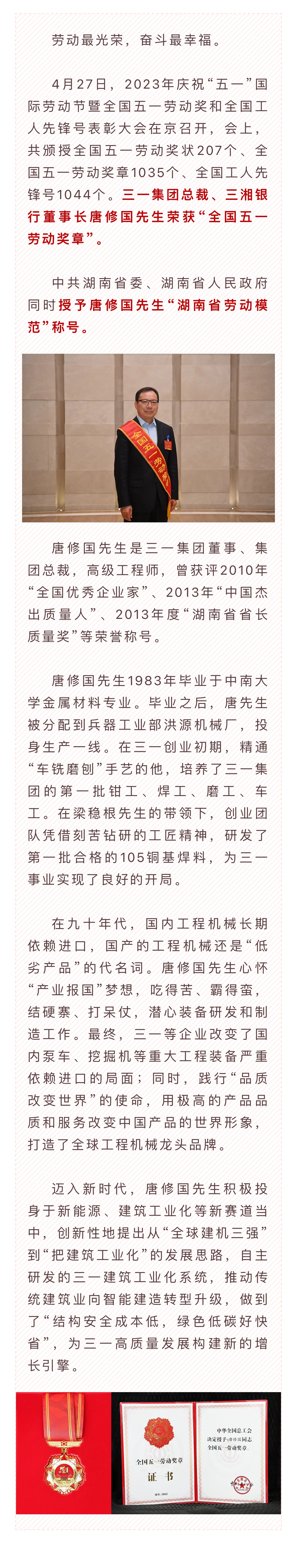 三湘银行董事长唐修国先生荣获“全国五一劳动奖章”!